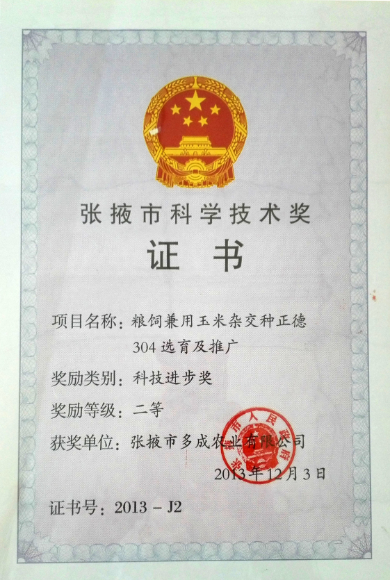 糧飼兼用玉米雜交種正德304選育及推廣——張掖市科學(xué)技術(shù)進步獎二等獎